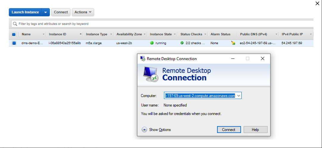 The cloud formation template deploys a Windows EC2 instance, with required drivers and softwares for AWS SCT, SQL Workbench. Before the demo, please note down all relevant parameters from the CloudFormation output that you’ll need to use in the subsequent steps. Connect to that EC2 instance using Remote Desktop client. |