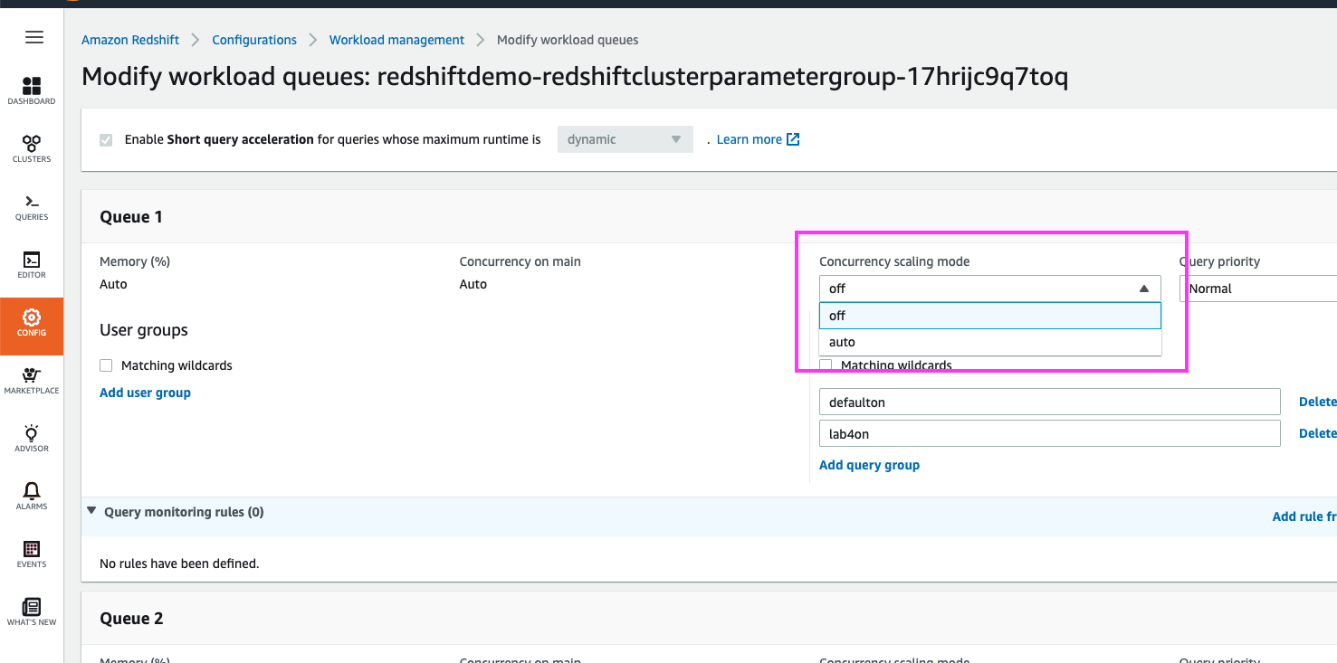 | Switching the ‘Concurrency Scaling mode’ from ‘off’ to ‘auto’ for Queue 1 will enable Concurrency Scaling specifically for this queue |